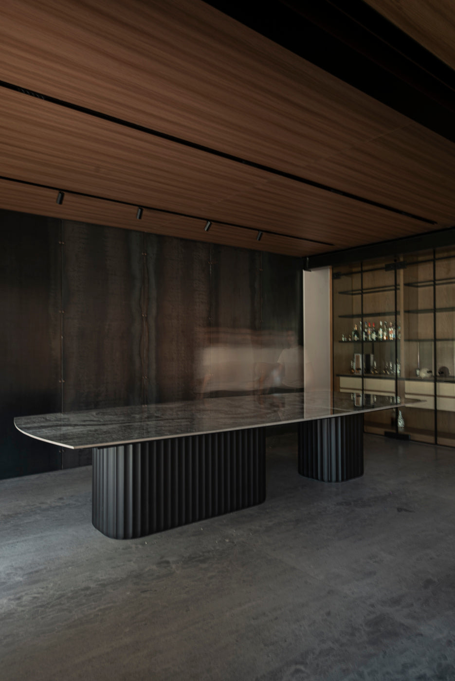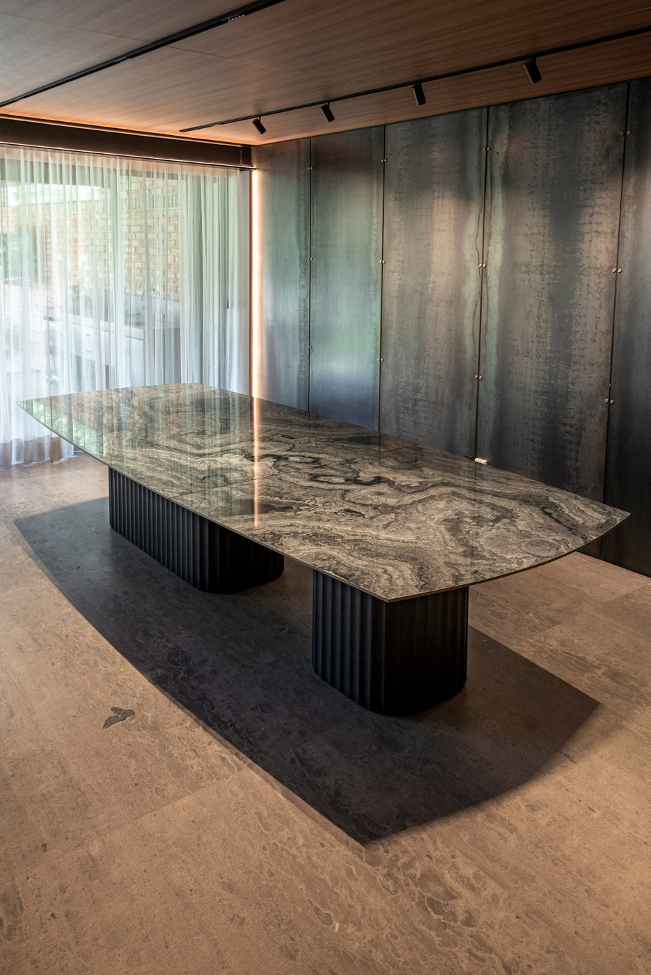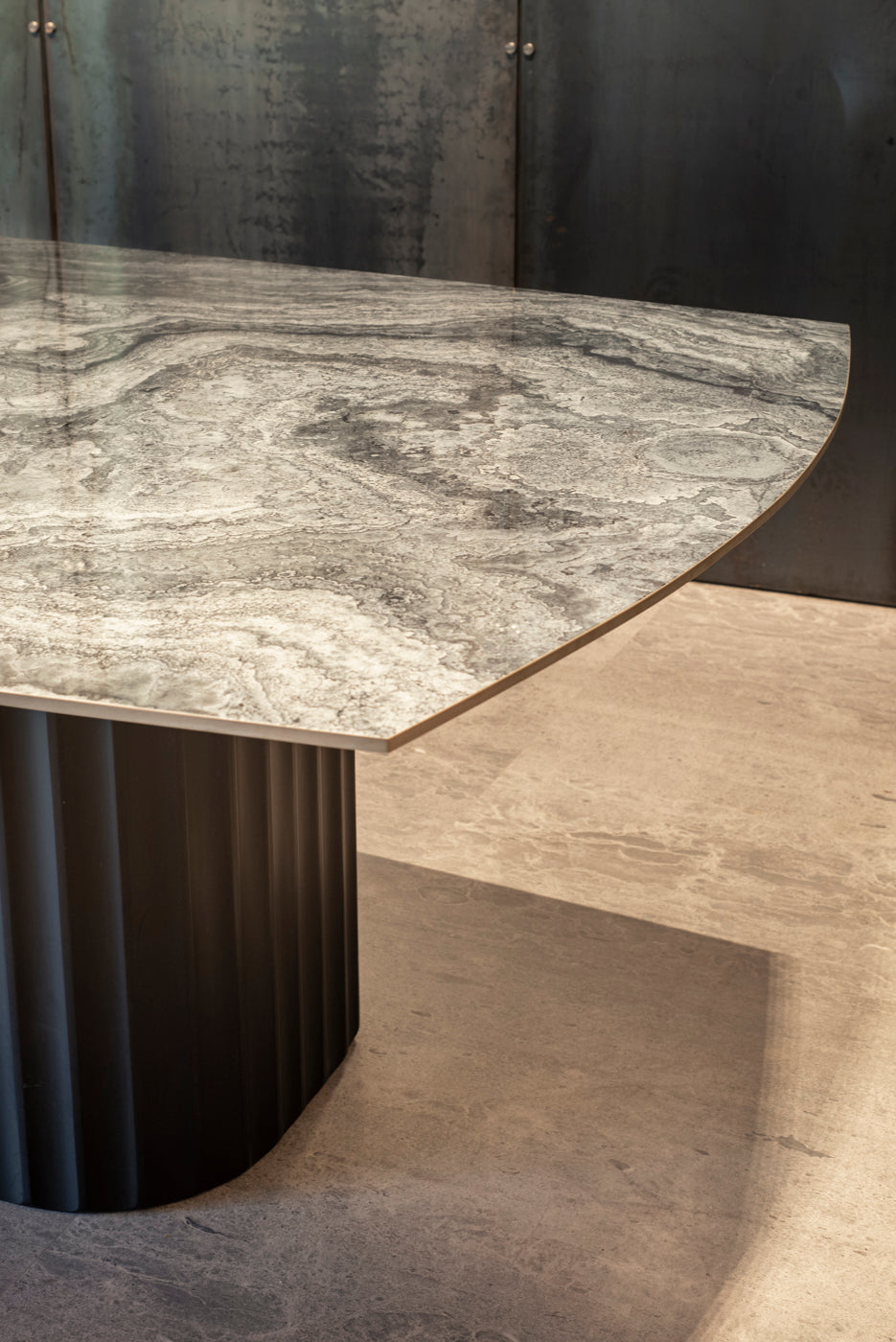 Esta mesa de gran formato fusiona una cubierta de piedra natural con bases escultóricas acanaladas en acabado negro, logrando una presencia imponente y sofisticada.