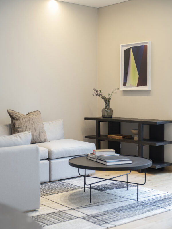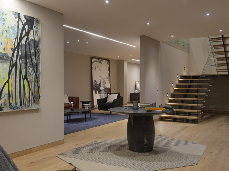 En Tres Picos, la elegancia contemporánea se combina con una estética cálida y acogedora. Las superficies de madera natural y los acabados artesanales brindan una sensación de conexión orgánica, mientras que los detalles cuidadosamente seleccionados, como la mesa de mármol y las obras de arte abstractas, aportan una sofisticación discreta. La iluminación, perfectamente distribuida, realza cada rincón, creando un juego de sombras y reflejos que potencia la profundidad y el carácter del ambiente.