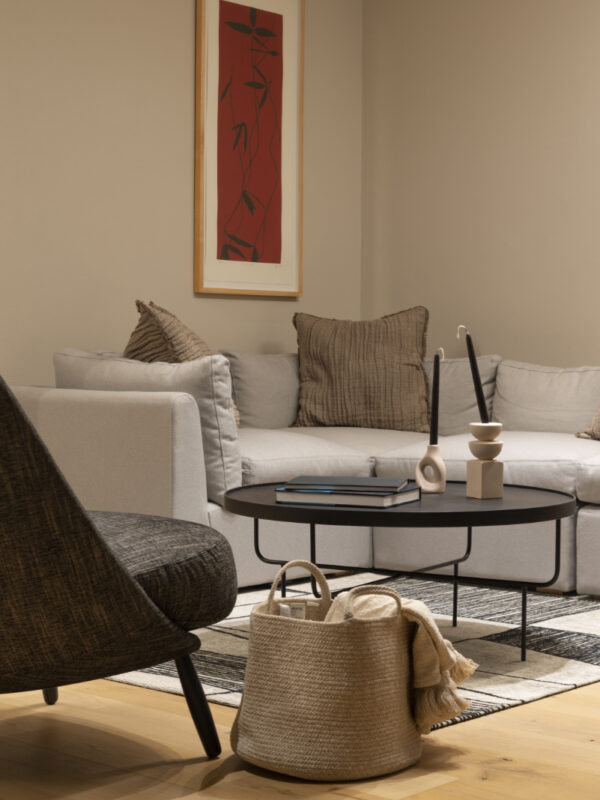 La distribución abierta permite una transición fluida entre las áreas, integrando el mobiliario moderno con una paleta de tonos neutros y acentos oscuros que equilibran el espacio. Las texturas de los materiales, desde las alfombras suaves hasta las sofas tapizadas, aportan calidez, mientras que los toques artísticos añaden personalidad y exclusividad. Este diseño transforma el espacio en un refugio íntimo y funcional, ideal para disfrutar en familia o recibir con estilo.